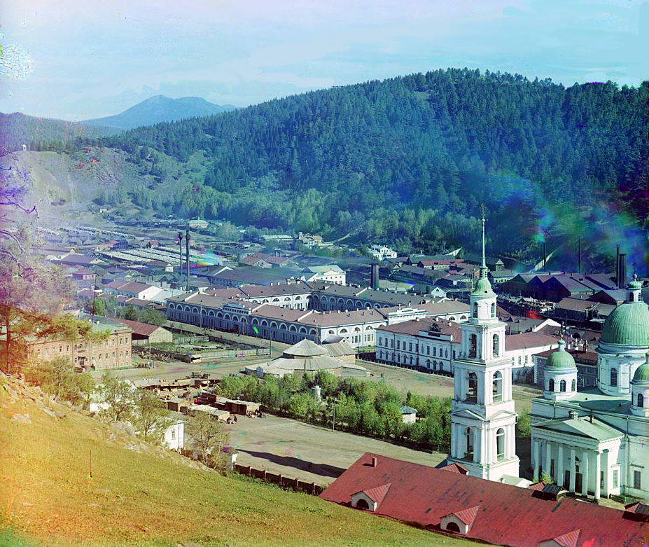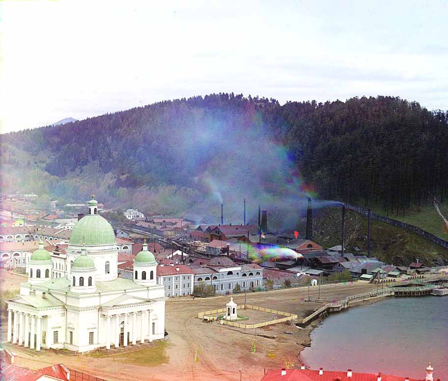 Златоусту очень повезло: в 1909 году тут побывал легендарный фотограф Прокудин-Горский и оставил потомкам возможность лицезреть полноцветные снимки этих мест. Причем много снимков, аж 43 - для тех времён фантастическая цифра. Давайте посмотрим это же место центра, но сверху. Свято-Троицкий собор, главная доминанта, был разрушен в годы активного религиоборчества (1933 г.), виден также завод со старой домной, которой сейчас тоже нет. Дорога также ведёт к вокзалу. Мост - цел, и приглядитесь внимательно к самой правой его части, где плотина, я это покажу ниже. (посмотреть все цветные снимки Златоуста из коллекции Прокудина-Горского, 1909 год, 43 штуки)