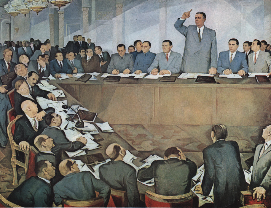 Итак, в левой части, лихорадочно зажав рукой пиджак, сидит Никита Сергеич. Ближе к нам - Брежнев с бровями, затем Вальтер Ульбрихт с лысинкой, ещё ближе - не опознал, кто такие. За Хрущёвым, дальше - Суслов, потом Микоян. Слева от Ходжи сидит Мехмет Шеху, премьер Албании, потом, возможно, китаец Ли Ли-Сань, затем тоже китаец (?).