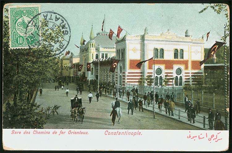 6б. Вид вокзала в османские времена (конец XIX века, открытка). Главный вход и променад - со стороны прибытия "Ориент-Экспресса".